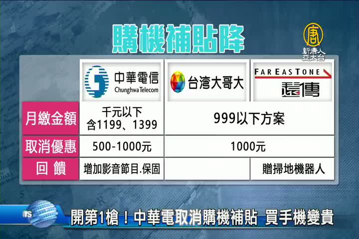 【新唐人亞太台 2017 年 10 月 06 日訊】iPhone8才剛上市沒有多久,昨天(10月5日)中華電信開出第一槍,10月份起將取消500~1000元的,綁約購機補貼優惠,預料台灣大哥大與遠傳電信也將跟進,取消約1000元的加碼優惠,不過亞太電信與台灣之星,則是逆勢加碼,最高999元!