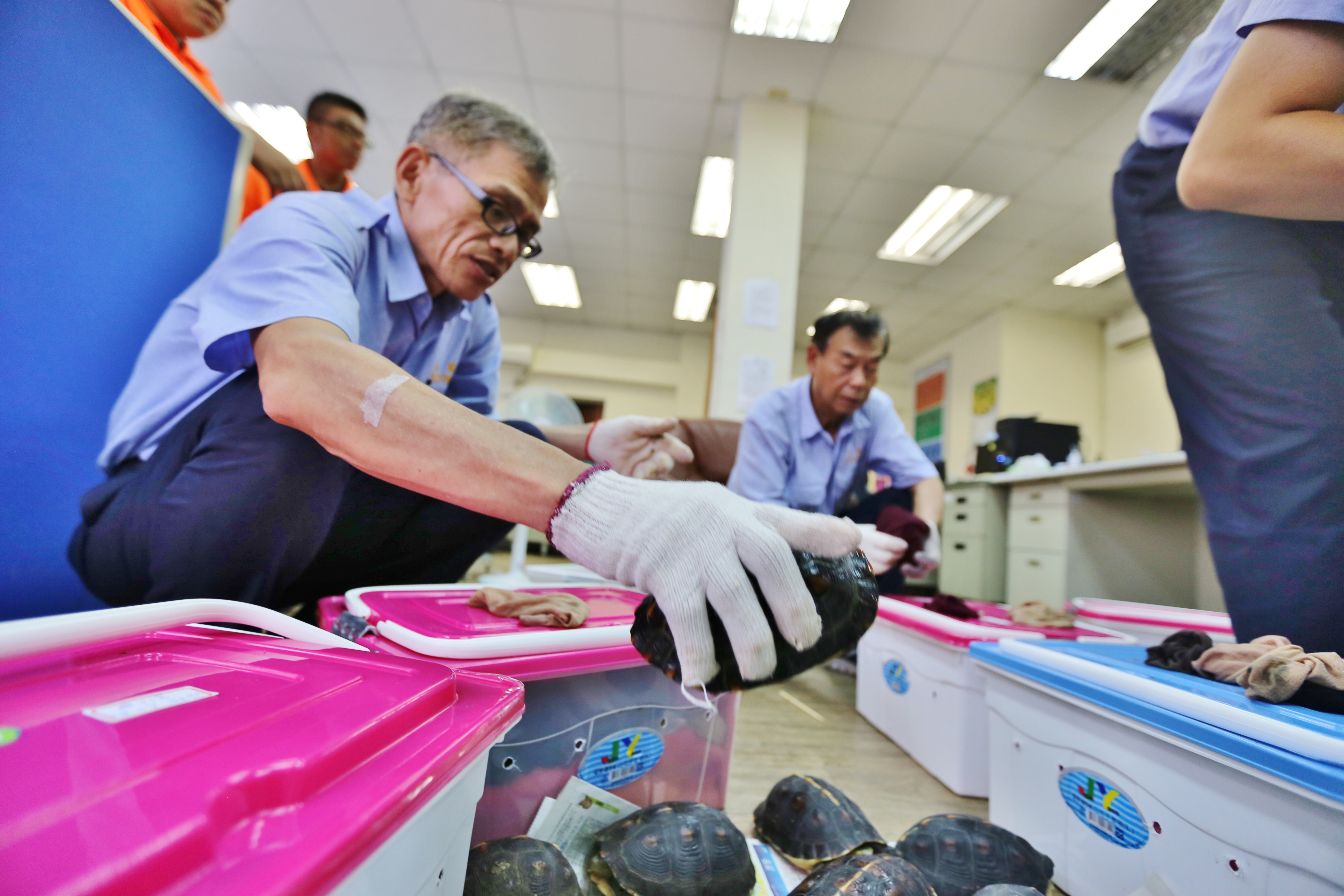 金門縣政府建設處表示,昨天(6日)經海關通報後,立即聯絡金門縣野生動物救援暨保育協會獸醫派員接手,在農林科及林務所同人歷經三個多小時逐隻檢傷、分類發現,298隻個體均為食蛇龜,甚至有20隻未滿3歲的幼龜,多數食蛇龜的鼻吻部、四肢都有不等的皮膚挫傷,疑似堆疊互相推擠造成。