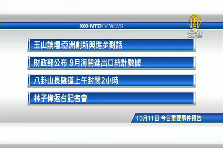 【新唐人亞太台 2017 年 10 月 11 日訊】接著看到,今天, 10月 11日,星期三 ,有哪些重要活動。首先是,玉山論壇今天舉辦,主題是,亞洲創新與進步對話,總統蔡英文將會出席。再來是,財政部公布 9月海關進出口統計數據。接著看到,八卦山長隧道,今天上午,雙向全線封閉2小時。最後是,旅美棒球好手,林子偉返台記者會。