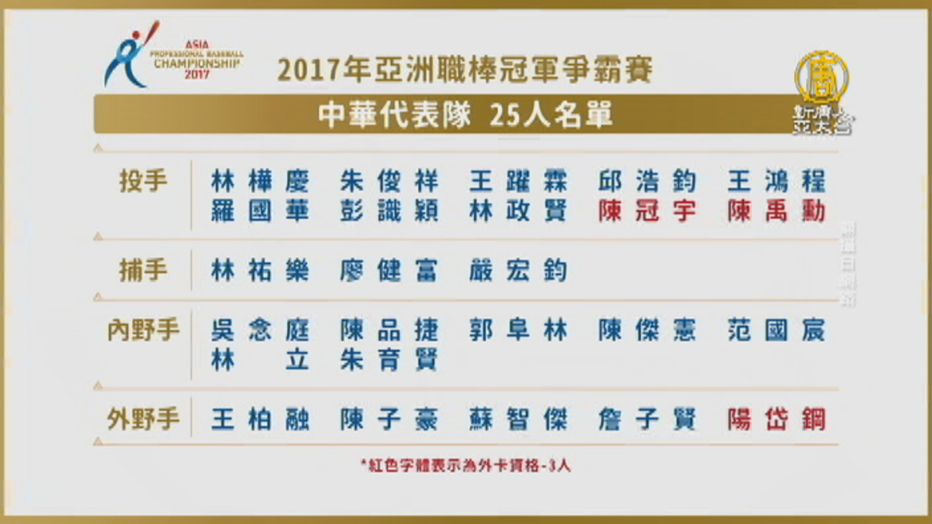 【新唐人亞太台 2017 年 10 月 11 日訊】再來看到,亞洲職棒冠軍爭霸賽,11月16日到19日將在東京開打,中職稍早正式宣布中華隊的25人名單,其中3張外卡名額已確定,包括旅日球星陽岱鋼、陳冠宇,還有中職救援王 陳禹勳。旅日選手宋家豪則沒有被列入。
