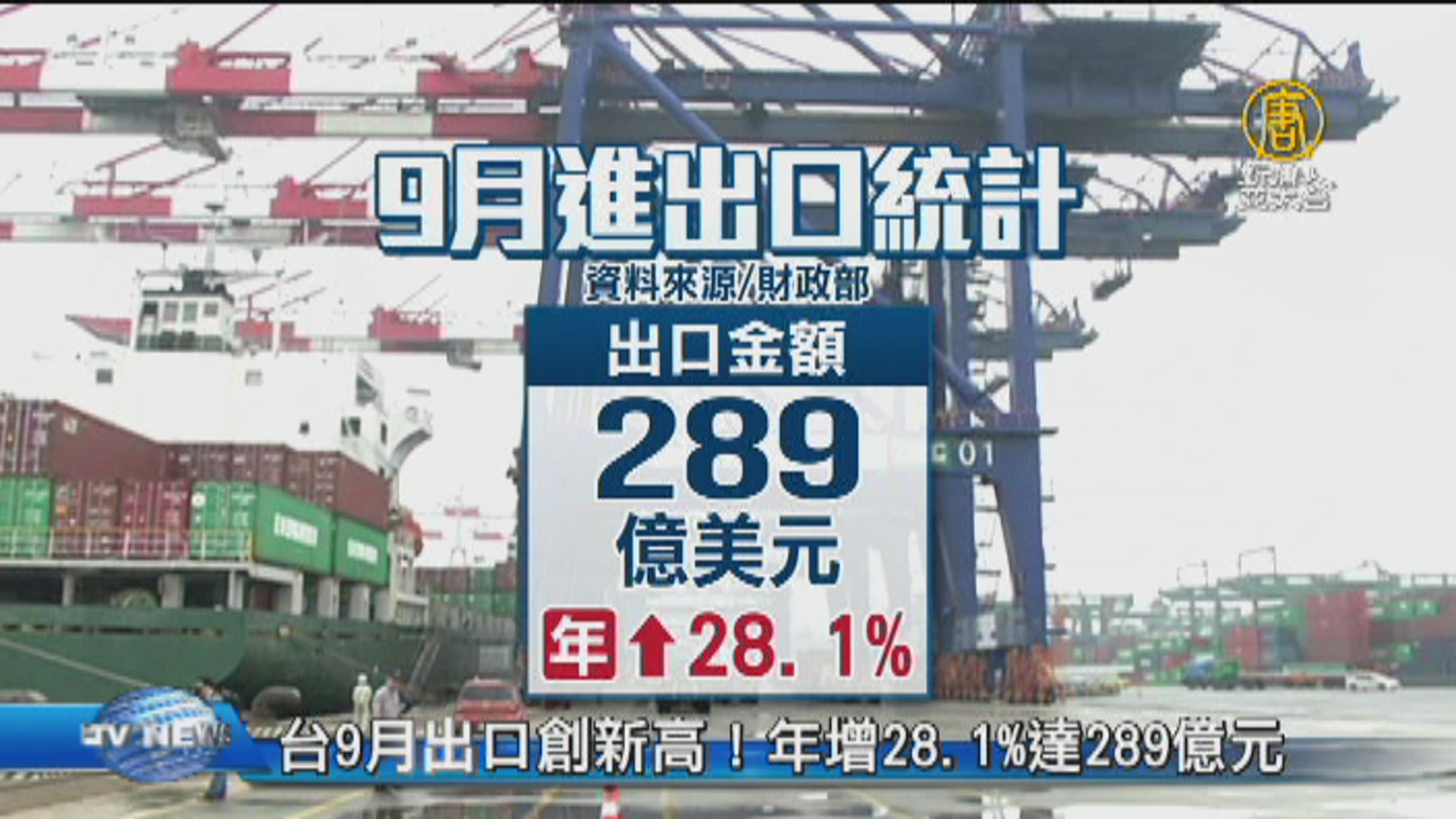 【新唐人亞太台 2017 年 10 月 11 日訊】全球經濟回溫,帶動了台灣出口表現,財政部今天公告9月進出口統計,出口金額為289億美元,創歷史新高,年增率28.1%,因此第4季出口展望仍樂觀。累計今年前3季出口為 2314.8億美元,比上年同期增加14.3%。連續4季出口年增率超過1成,更是2011年第4季以來首見。
