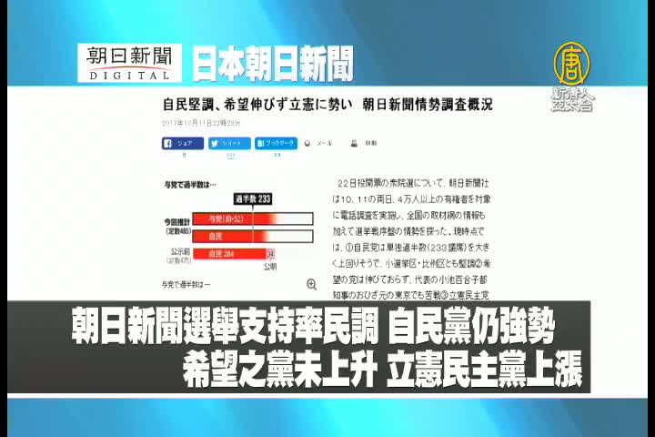 【新唐人亞太台 2017 年 10 月 12 日訊】來看到日本朝日新聞報導:朝日新聞選舉支持率民調,自民黨仍然強勢,希望之黨支持率未上升,立憲民主黨支持率上漲。