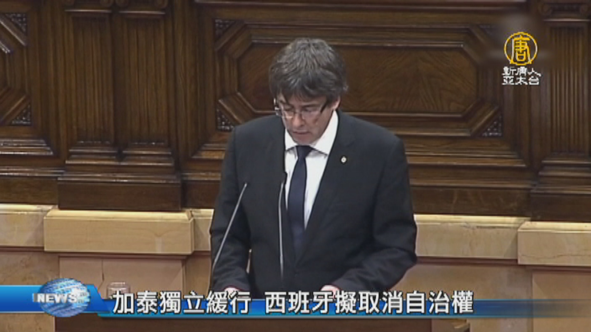2017-10-11 07:59:07早安新唐人,先帶您關心,牽動歐洲政局神經的,加泰隆尼亞脫西獨立風波,今天凌晨,自治區主席 普伊格蒙特 發表演說,決定暫時擱置宣告獨立。