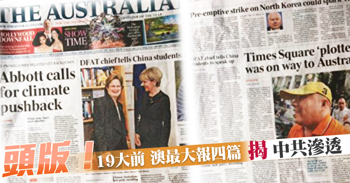 據大紀元綜合編譯報導,目前正是中共十九大前的敏感時刻,《澳洲人報》這樣高調、密集揭露中共在澳洲活動,再次引起澳洲社會的關注。