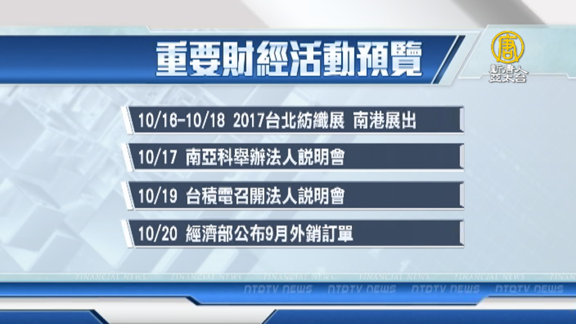 【新唐人亞太台 2017 年 10 月 15 日訊】帶您看到下週,有哪些重要的財經活動。