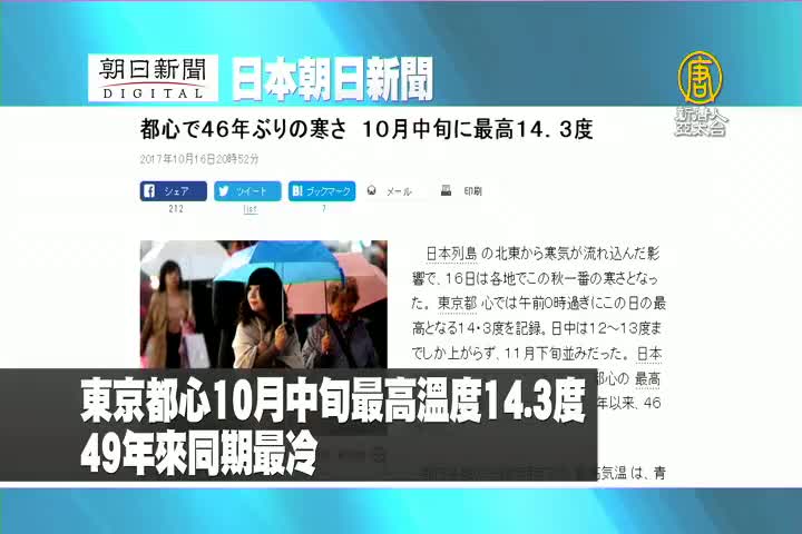 【新唐人亞太台 2017 年 10 月 17 日訊】來看到日本朝日新聞報導:日本東京都10月中旬最高溫14.3度, 49年來同期最冷。