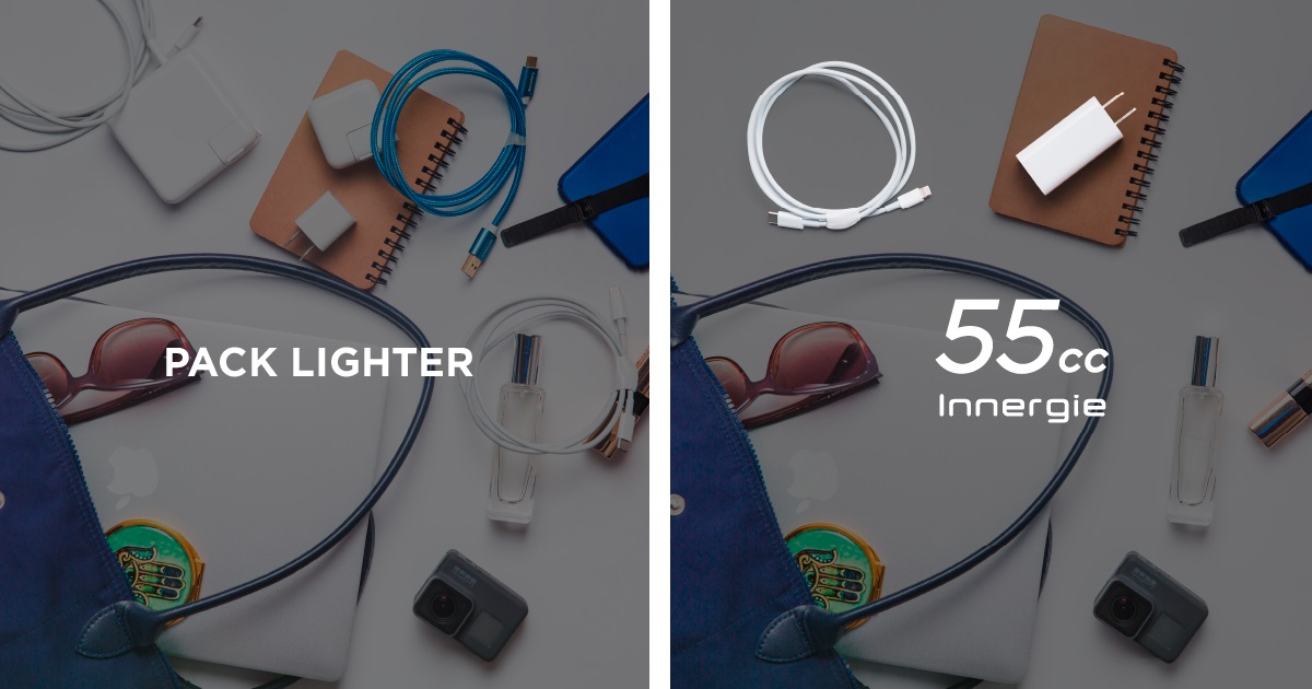 Innergie 55cc,來自台達電運用獨家技術,有世界首創三維度專利電路設計、最新薄型變壓器技術,結合高效節能技術,是一般變壓器體積的1/4、重量的1/3,更將60W充電效率的高功率輸出功能做進僅有55cc的小巧容積內,企圖完整解決現代人的生活需求。