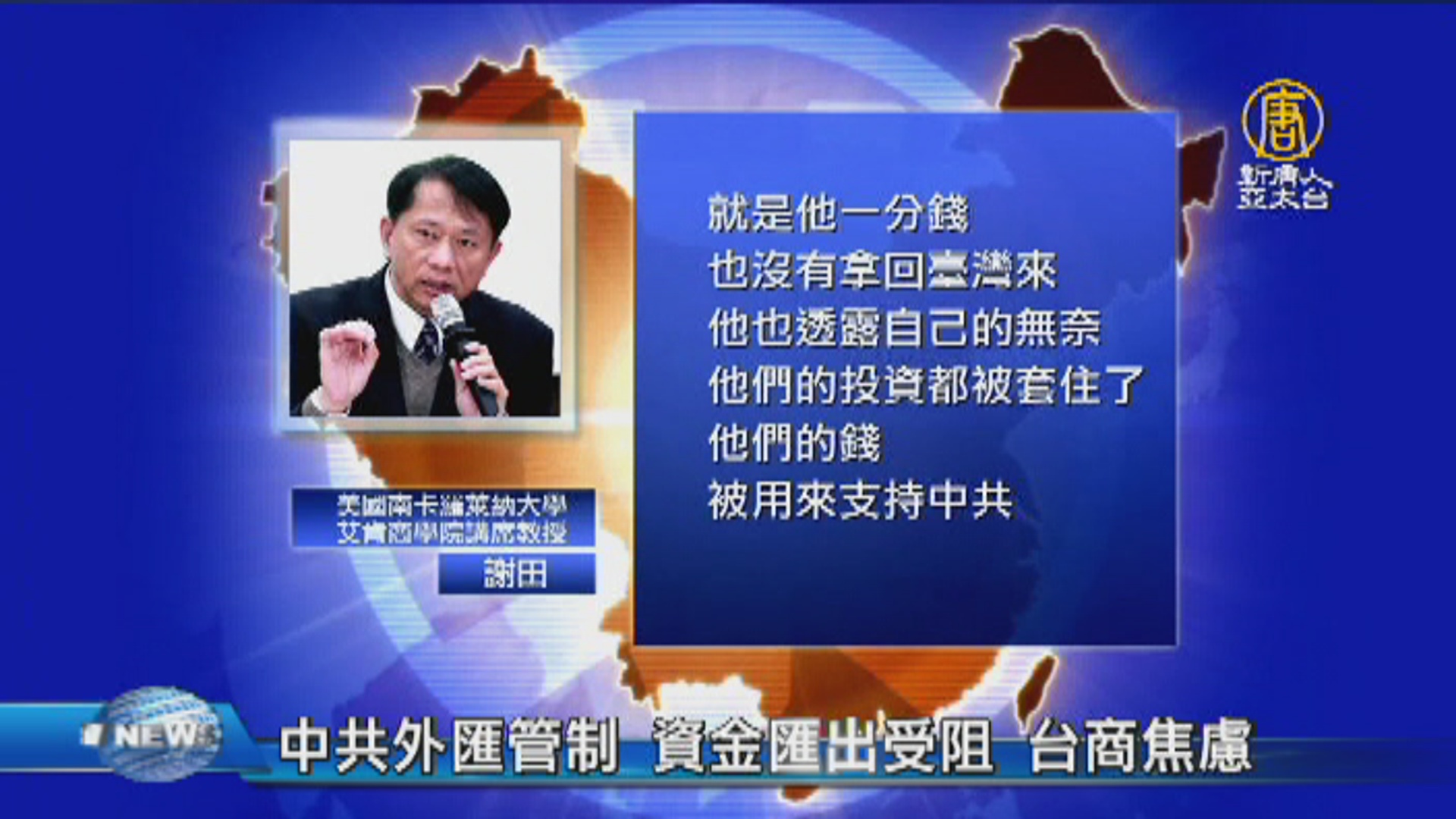 美國南卡羅萊納大學艾肯商學院講席教授 謝田:「一個公司的董事長,他在跟我們說他的公司在大陸如何如何成功,後來我私下裡問他的時候,他承認所謂的成功在大陸賺到的錢都必須在大陸直接再投資,就是他一分錢也沒有拿回臺灣來,他也透露自己的無奈,他們的投資都被套住了,他們的錢被用來支持中共。」
