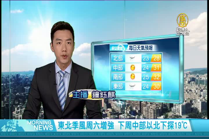 【新唐人亞太台 2017 年 10 月 19 日訊】歡迎您收看10月19日的早安新唐人,我是鐘鈺麒。先來帶您關心今天的天氣情況。今天的天氣,和昨天類似。不過,入秋首波東北季風,星期六起,開始增強,氣象局預測,從星期天到下週二,北部及東北部低溫下探19度,中部因為輻射冷卻效應,可能也會有19度低溫,提醒您留意了。帶您一起來看到國際媒體重要訊息。