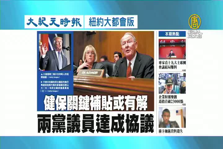 【新唐人亞太台 2017 年 10 月 19 日訊】接著看到大紀元時報紐約大都會版報導:美國健保關鍵補貼或有解,兩黨議員達成協議。