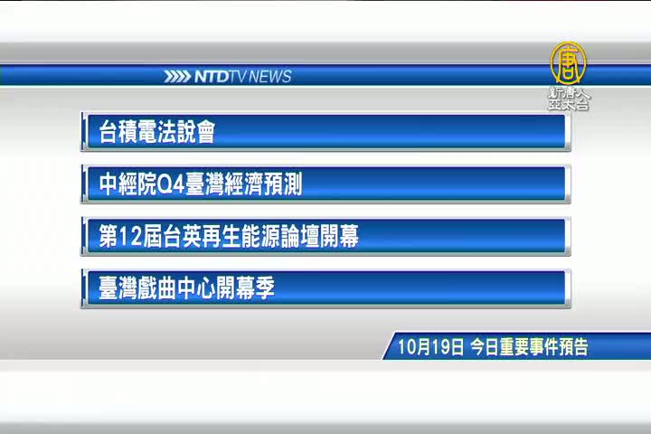 【新唐人亞太台 2017 年 10 月 19 日訊】接著看到,今天, 10月19日,星期四,有哪些重要活動。首先是,台積電法說會。再來是,中經院發布2017年第4季臺灣經濟預測。另外,第12屆台英再生能源論壇,今天開幕。最後是,藝文消息,臺灣戲曲中心開幕季,今天登場。
