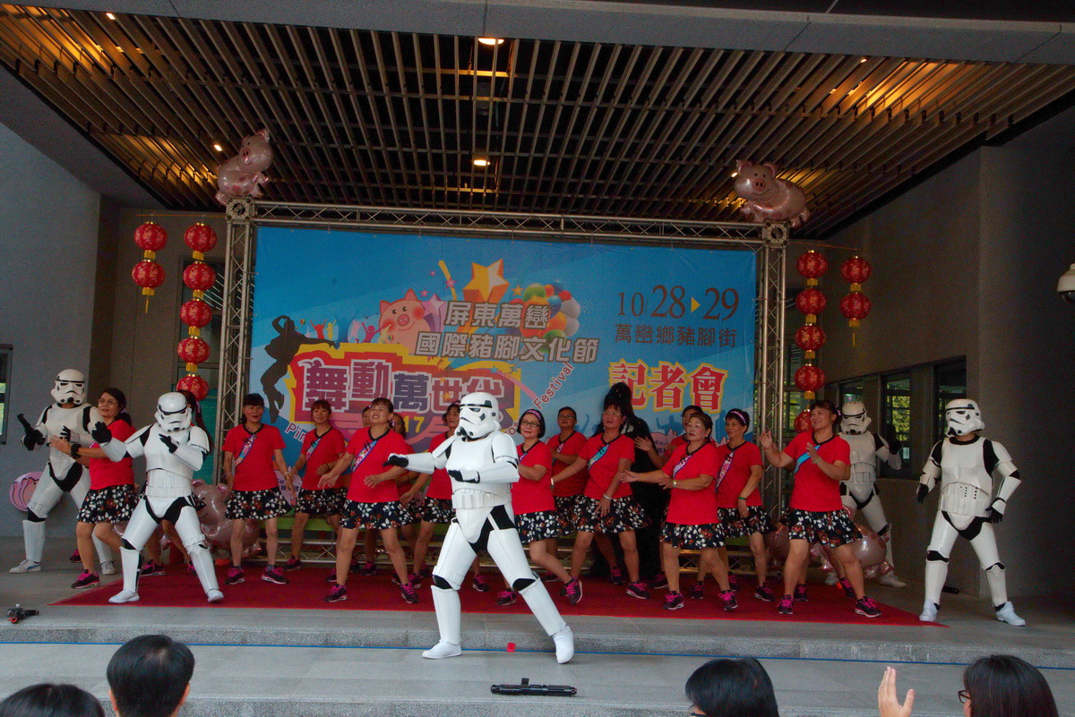 【新唐人亞太台 2017 年 10 月 19 日訊】屏東縣萬巒鄉公所18日舉辦「2017年屏東萬巒國際豬腳文化節」記者會,播放豬腳舞神曲~~絕世好咖,鄉內赤山愛鄉協會媽媽們經過10分鐘的現場教學,從客家風味傳統舞蹈轉換成街舞架式,在台上和「星際大戰」的黑武士、暴風兵尬舞。