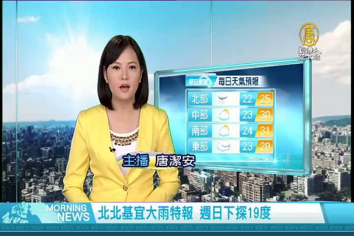 【新唐人亞太台 2017 年 10 月 20 日訊】歡迎您收看10月20日的早安新唐人,我是唐潔安。先來帶您關心今天的天氣情況。今天凌晨,氣象局針對台北市、新北市、基隆市、宜蘭縣發布大雨特報。至於中南部地區,今天則是晴朗悶熱,高溫上看30度。另外要特別提醒您的是,星期天東北風報到,各地都會轉涼,低溫可能會跌破20度,提醒您留意保暖,注意早晚溫差。。帶您一起來看到國際媒體重要訊息。