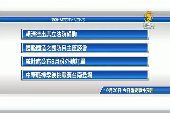 【新唐人亞太台 2017 年 10 月 20 日訊】接著看到,今天, 10月20日,星期五 ,有哪些重要活動。首先是,行政院長賴清德出席立法院備詢。另外,今天在立院有一場,國艦國造之國防自主座談會。另外,今天統計處會公布9月份外銷訂單。最後是體育消息,中職季後挑戰賽,今天在台南登場。