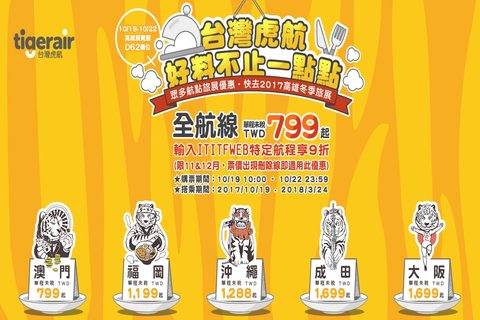 歡慶高雄市旅行公會冬季國際旅展登場,台灣虎航也加碼推出全航線線上旅展,促銷期間為2017年10月19日上午10:00起至2017年10月22日晚間23:59止,可訂購的旅行日期為2017年10月19日至2018年3月24日,就有機會享受旅展單程未稅NT$799起的優惠促銷價,近期內欲於2017年11月至12月間出國旅遊消化年假者,還可輸入促銷代碼「ITITFWEB」使用,若是搜尋結果於票價處有出現刪除線並出現較低的票價,即表示機票優惠價格再享9折優惠。