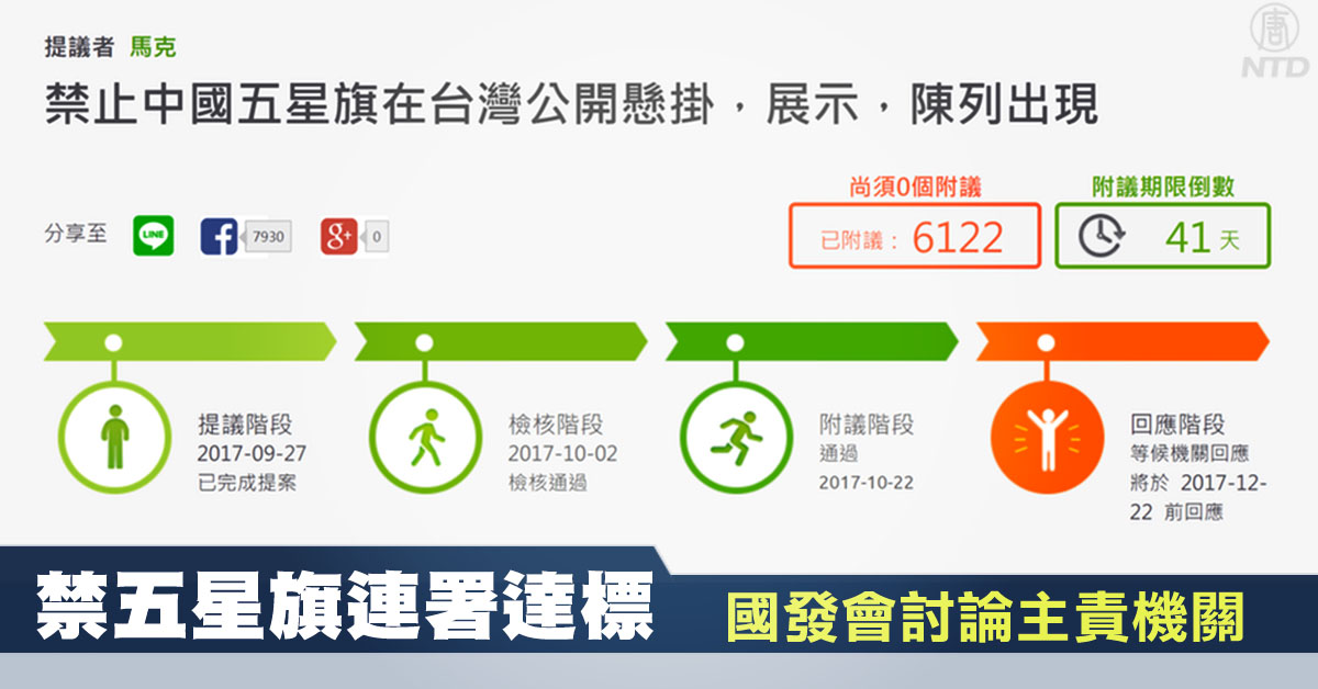 【新唐人亞太台 2017 年 10 月 22 日訊】受不了中共在台灣無孔不入的統戰,有網友在公共政策網路平台上,提案台灣應「禁掛五星旗」,連署附議人數今天通過,相關單位應於今年12月22日前回應。提案內容表示,中國不承認台灣是主權獨立國家,文攻武嚇動作不斷,五星旗在台灣各地出現,使台灣民眾沒有危機意識,因此提議「增設刑法條文分裂國土外患內亂罪,禁止中國五星旗在台灣公開懸掛,展示、陳列出現」。最新消息,國發會表示,本週將開會討論主責機關。