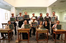 展場結合花園與教室場景,讓民眾回味;張花冠也現場揮毫,結合時事,畫香蕉樹和愛採香蕉的野猴子,藝術家也留下花卉畫作,大家開心合影。