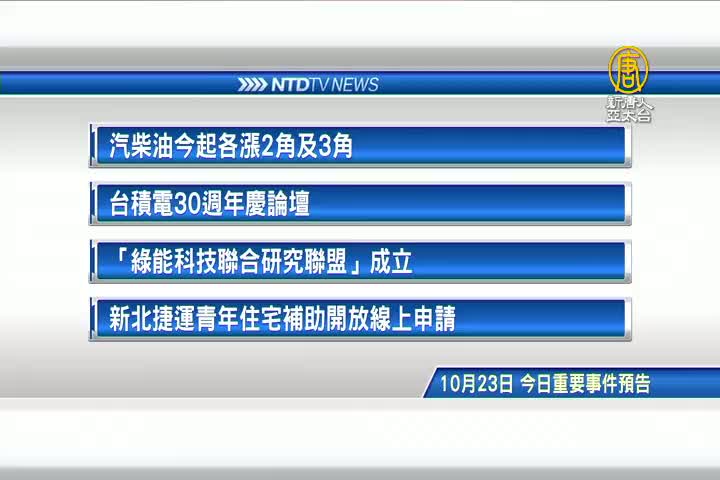 【新唐人亞太台 2017 年 10 月 23 日訊】接著看到,今天, 10月23日,星期一 ,有哪些重要活動。首先是,民生消息,汽柴油今天起,各漲2角及3角。財經消息,台積電舉辦30週年慶論壇。再來是,「綠能科技聯合研究聯盟」,今天在台南宣布成立。最後是,新北捷運青年住宅補助,今天首次開放線上申請。