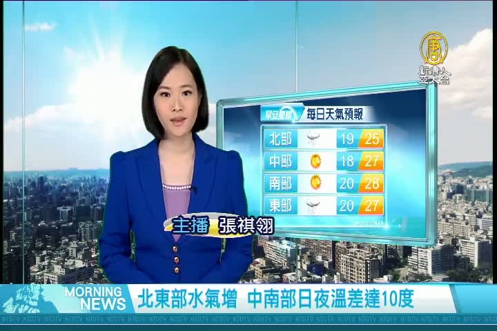 【新唐人亞太台 2017 年 10 月 24 日訊】歡迎您收看10月24日的早安新唐人,先來帶您關心今天的天氣情況。受到東北季風影響,今天東半部及桃園以北雲量較多, 新竹以南則維持穩定天氣,各地夜晚清晨偏涼,中南部日夜溫差可以達到10度左右,提醒觀眾朋友,適時調整衣著。。帶您一起來看到國際媒體重要訊息。