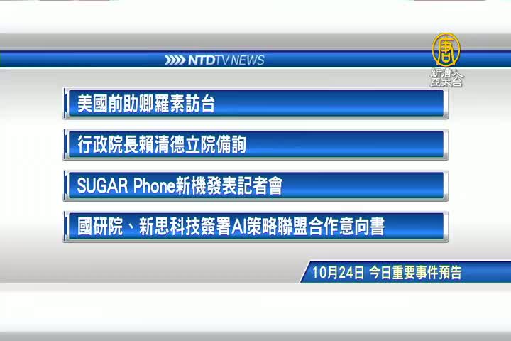 【新唐人亞太台 2017 年 10 月 24 日訊】接著看到,今天, 10月24日,星期二 ,有哪些重要活動。首先是,美國前助理國務卿羅素,首度訪台,今天將在政大演講。再來是,行政院長賴清德,今天將赴立院備詢。接著看到,財經消息,SUGAR Phone 新機發表記者會。最後是,國研院與新思科技,簽署AI策略聯盟合作意向書。