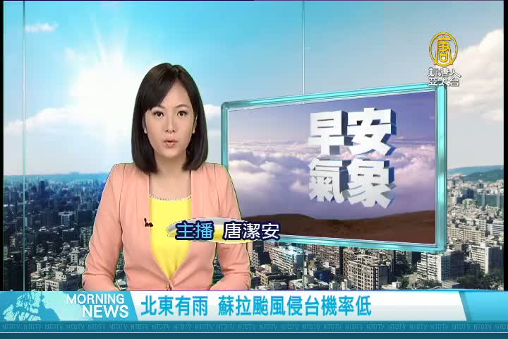 【新唐人亞太台 2017 年 10 月 25 日訊】歡迎您收看10月25日的早安新唐人,我是唐潔安。先來帶您關心今天的天氣情況。今天桃園以北和宜蘭地區,整天都是偏向有雨天氣。新竹以南天氣,則相對穩定晴朗,另外,蘇拉颱風昨天形成,目前初判侵台機率低。帶您一起來看到國際媒體重要訊息。