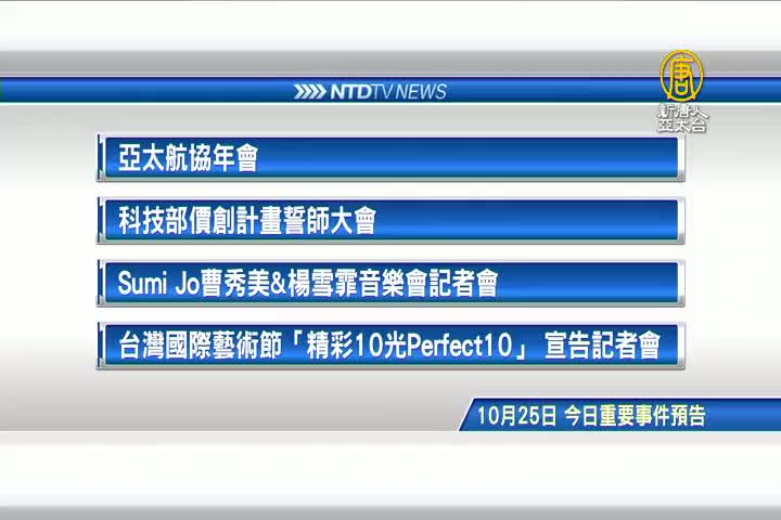 【新唐人亞太台 2017 年 10 月 25 日訊】接著看到,今天, 10月25日,星期三 ,有哪些重要活動。首先是,亞太航協年會,今天在台北登場。再來是,今天有一場科技部 價創計畫誓師大會,副總統陳建仁將出席。再來看到,藝文消息, 葛萊美獎得主,韓國女高音 曹秀美,這次將與吉他演奏家楊雪霏,在台灣演出。最後是,台灣國際藝術節「精彩10光」 宣告記者會。