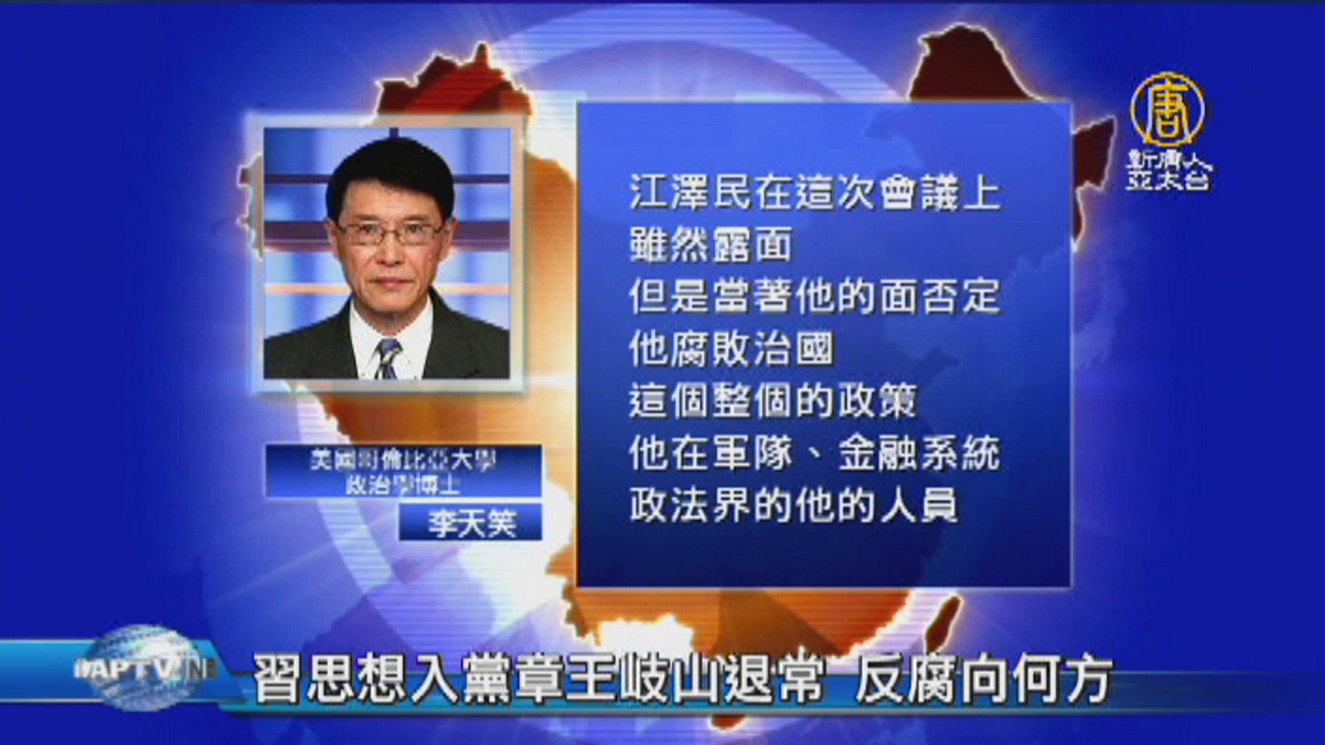 美國哥倫比亞大學政 治學博士 李天笑:「江澤民在這次會議上雖然露面,但是當著他的面否定了他腐敗治國整個的這個政策,他在軍隊、金融系統、政法界的他的人員不斷的被清洗,而且當著他的面肯定拿下他的人員作為一個重要的成果,這個對他來說當然是一個致命的打擊,從這個角度上來看,反腐打江這一點上確立的。」