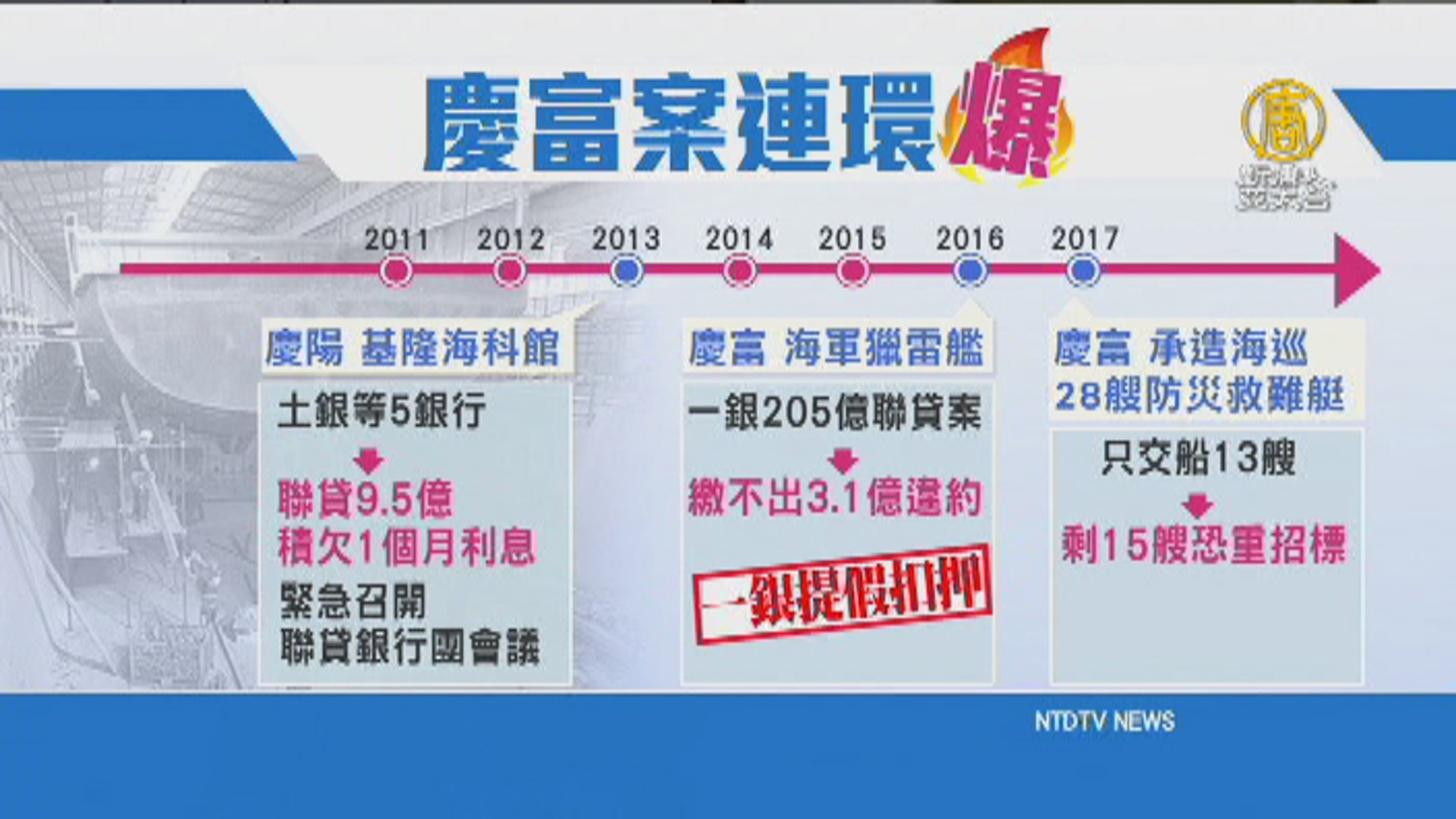 【新唐人亞太台 2017 年 10 月 27 日訊】繼慶富聯貸案違約,慶富造船廠旗下子公司慶陽的9.5億元聯貸案,聯貸主辦行土地銀行今天也緊急召開債權銀行會議,最後宣告認定交叉違約,銀行團後續將討論是否實施融資介入權,另找廠商完成海科館的BOT案。案件連環爆,一分鐘,帶您了解。