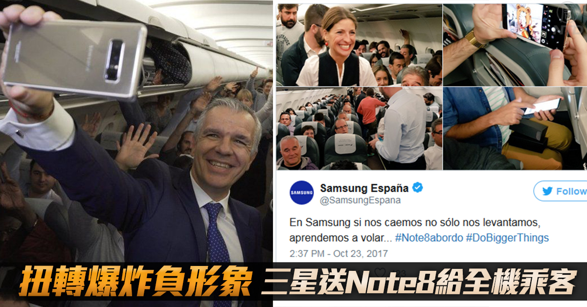 去年三星Galaxy Note 7手機電池爆炸意外頻傳,被多家航空公司禁止,成為史上第一支禁止登機的智慧型手機,三星為了挽回態勢,日前在西班牙航空的飛機上,免費送出Note 8手機給200名乘客,希望扭轉消費者對三星的印象。