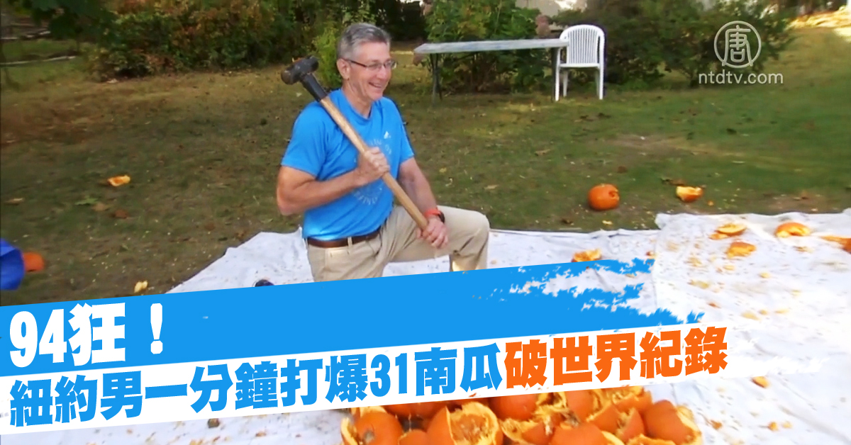 【新唐人亞太台 2017 年 10 月 27 日訊】萬聖節就要到了,在美國紐約有一位男子,挑戰在1分鐘之內用大鐵鎚打碎最多南瓜紀錄,最後他打碎了31個南瓜,破金氏世界紀錄。不過,這些被打碎的南瓜也沒浪費,分給當地廚師,做成南瓜餅給大家享用。