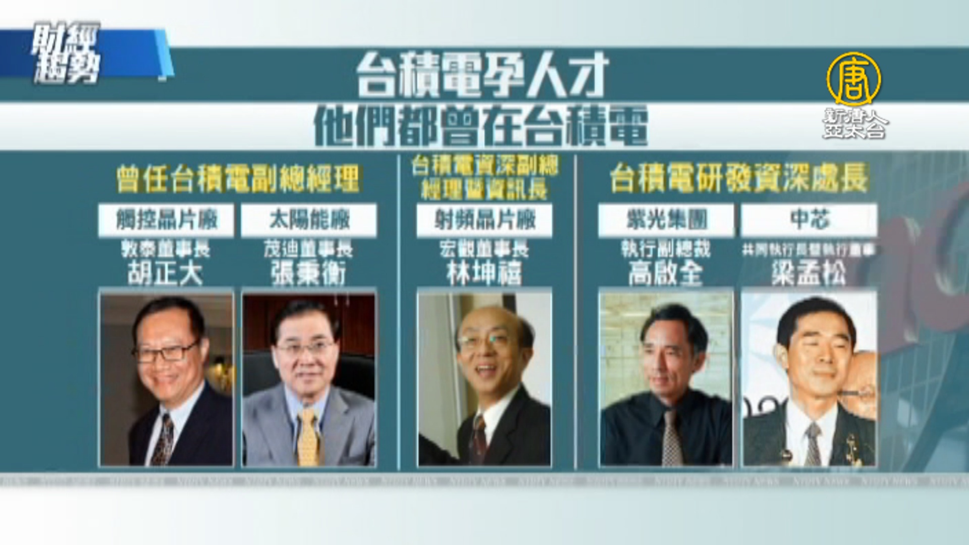 【新唐人亞太台 2017 年 10 月 29 日訊】半導體製程的升級戰爭,每年都在打,既燒錢,又需要人才,彭博專欄就指出,目前,全球半導體業的資金與工程人才,足以跟台積電匹敵的,只有南韓三星電子與美國英特爾。觀眾朋友知道嗎?30年來,台積電孕育無數人才,包括宏碁董事長陳俊聖,聯發科共同執行長蔡力行,都曾經是,台積人。