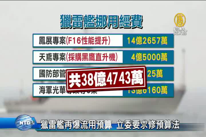【新唐人亞太台 2017 年 10 月 29 日訊】得標國艦國造的「慶富造船」爆出弊案,不過有問題的恐怕不只慶富,立委黃國昌發現,國防部去年竟挪用F-16戰機提升計劃預算14.2億,還有海軍光華專案等預算,總共38億,支應獵雷艦經費,質疑國防部違反預算法,但國防部澄清,那是「流用」預算,並非「挪用」,會去立院報告說明。