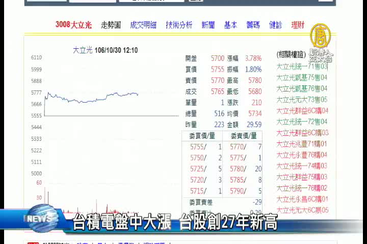 【新唐人亞太台 2017 年 10 月 30 日訊】上週五美國科技股大漲,帶動今天台股蘋概股開盤強勢上漲,其中台積電早盤一度來到245元,再創歷史新高價,鴻海、大立光漲幅也超過2%,電子股成交比重一度超過8成,帶動台股一度大漲130餘點,再創27年新高。