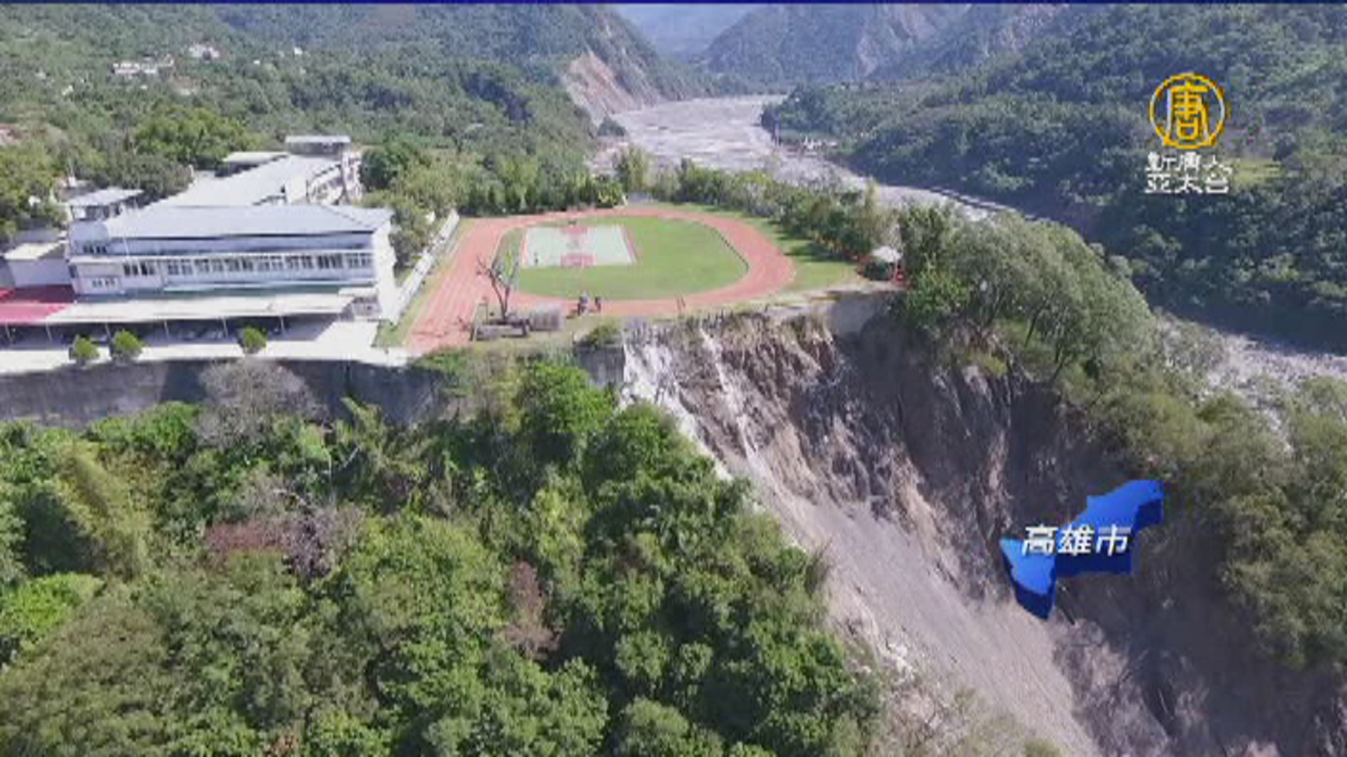 【新唐人亞太台 2017 年 10 月 30 日訊】再來看到的是,這兩天大家都在關注的這兩張空拍照片,海拔500多公尺的高雄市桃源區興中國小操場,操場跑道的邊邊,就是坍塌的河床地,讓人怵目驚心,深怕孩子活動時,一個不小心,跌入20層樓高的深谷,校方今天趕緊澄清說,已經做好岩盤固坡作業,土石不會再滑落,10月初還辦過運動會,使用上,絕對安全。