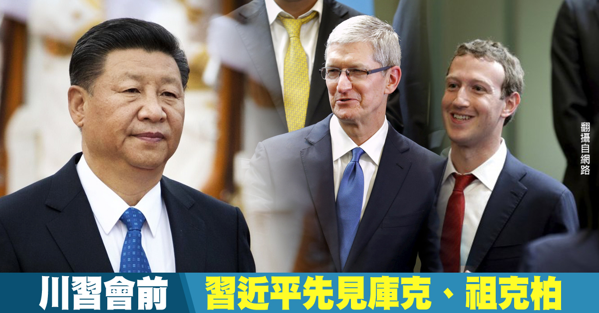 十九大閉幕後,中國國家主席習近平30日晚間,首度和許多中外企業家見面。中共官媒報導,習近平在人民大會堂接見北京清大經濟管理學院顧問委員會的中外委員,包括鴻海董事長郭台銘、阿里巴巴創辦人馬雲、高盛執行長布蘭克芬、黑石集團董事長蘇世民等人。而其中最引人注目的,就是美國蘋果公司執行長庫克與臉書創辦人祖克柏。