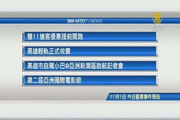 【新唐人亞太台 2017 年 11 月 01 日訊】接著看到,今天, 11月1日,星期三 ,有哪些重要活動。首先是,迎戰雙11網購節,今天許多電商業者都會提前推出優惠。再來是,高雄輕軌今天開始正式收費。另外,高雄市交通局,今天也要召開自駕小巴、亞洲新灣區啟航記者會。最後是,第二屆亞洲國際電影節,今天登場。