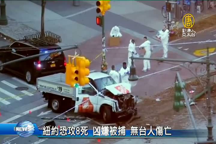 【新唐人亞太台 2017 年 11 月 01 日訊】新聞一開始,先帶您關心,在萬聖節,美國總統川普就要出訪亞洲之前,紐約曼哈頓下城世貿中心附近,發生恐怖攻擊事件,一名男子駕駛卡車,蓄意衝撞,造成8死、11個人受傷,這是2001年911以來,紐約最嚴重的恐攻事件。警方在兇嫌車內找到伊斯蘭國IS的旗幟,也成功制伏了這名嫌犯。這名29歲的嫌犯,來自中東烏茲別克,2010年入境美國,擁有美國永久居留權。紐約州長古莫說,這起事件應是「孤狼」所為,沒有大規模犯案計畫。另外,台灣外交部證實,沒有台灣民眾在這起恐攻中傷亡。