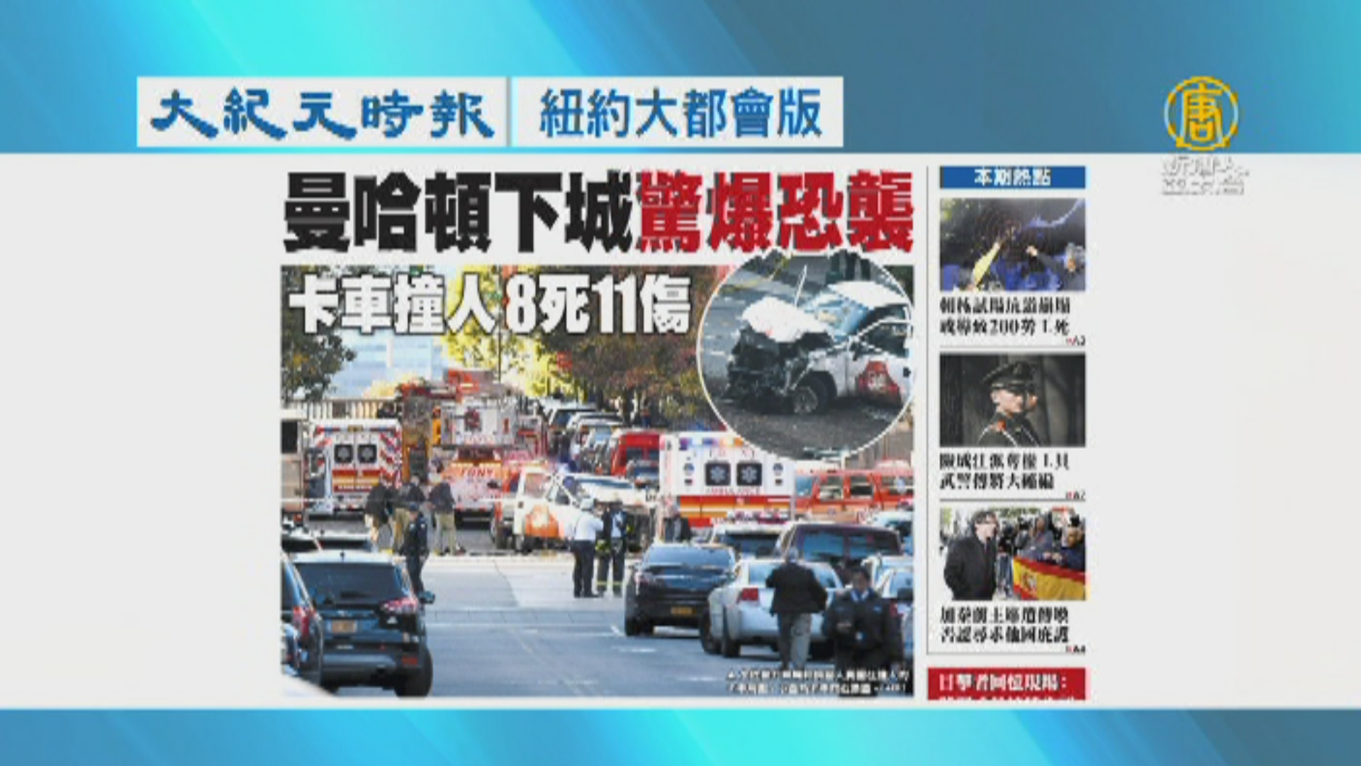 【新唐人亞太台 2017 年 11 月 02 日訊】接著看到大紀元時報紐約大都會版報導:美國曼哈頓下城驚爆恐怖襲擊,卡車撞人8死11傷。