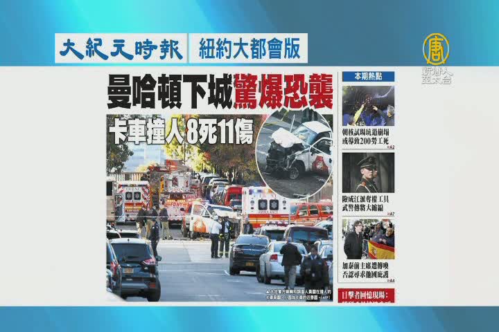 【新唐人亞太台 2017 年 11 月 02 日訊】接著看到大紀元時報紐約大都會版報導:美國曼哈頓下城驚爆恐怖襲擊,卡車撞人8死11傷。