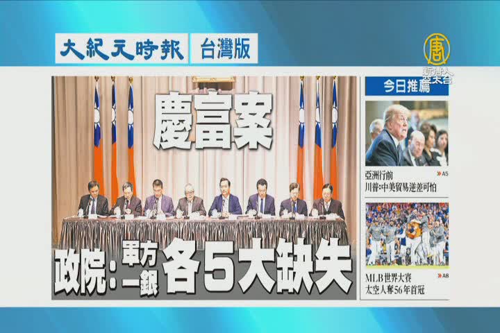 【新唐人亞太台 2017 年 11 月 03 日訊】繼續看到大紀元時報台灣版報導:慶富案,行政院表示,軍方與一銀各有五大缺失。