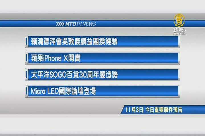 【新唐人亞太台 2017 年 11 月 03 日訊】接著看到,今天,11月3日,星期五 ,有哪些重要活動。首先是,政治消息,賴清德拜會吳敦義,請益閣揆經驗。 財經消息,蘋果iPhone X開賣。再來是,太平洋SOGO百貨30周年慶造勢,企業高層將出席。最 後是,Micro LED 國際論壇登場。