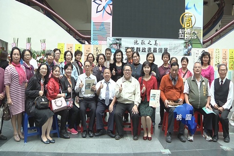 中壢區公所大廳聚集許多鄉親,里長帶著里民,來為范姜群政個人書畫展加油。