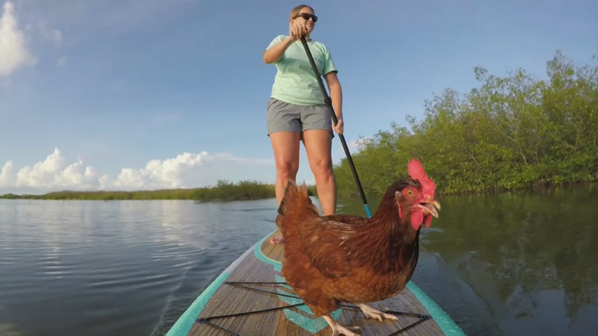 【新唐人亞太台 2017 年 11 月 03 日訊】立槳衝浪是近年來很流行的水上運動,站在立槳衝浪板上用單槳划行前進,初學者可以坐著或跪在板子上玩,是項較安全的水上活動。佛羅里達一位女孩甚至還帶著她的寵物雞,在礁島群之間一起立槳衝浪,看上去相當享受。