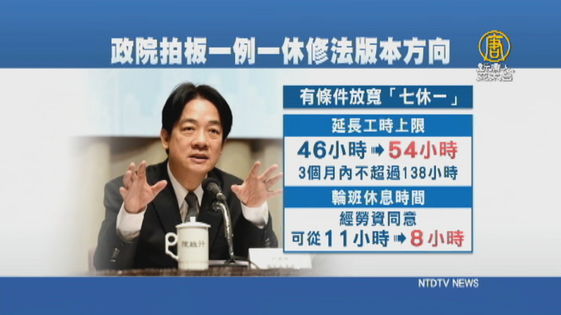 【新唐人亞太台 2017 年 11 月 07 日訊】一例一休修法方向,政院方面拍板敲定,不過細節內容一出,勞團說,勞基法倒退10年,將在星期四發動抗議,民進黨立委,也擔心修法對勞工造成衝擊,而工商團體,則是不滿修法做半套,爭議現在彷彿是 越演越烈。