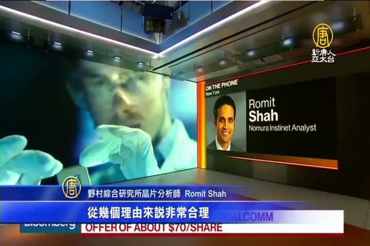 【新唐人亞太台 2017 年 11 月 07 日訊】再來看到,科技大廠博通,上週才高調宣布將總部遷回美國,週一,博通又宣布,將以總值約1300億美元,相當於 台幣3.9兆元,併購高通,不過,分析師指出,這樣的價格恐怕不容易贏得高通股東同意,但如果通過,蘋果將成最大受惠者。