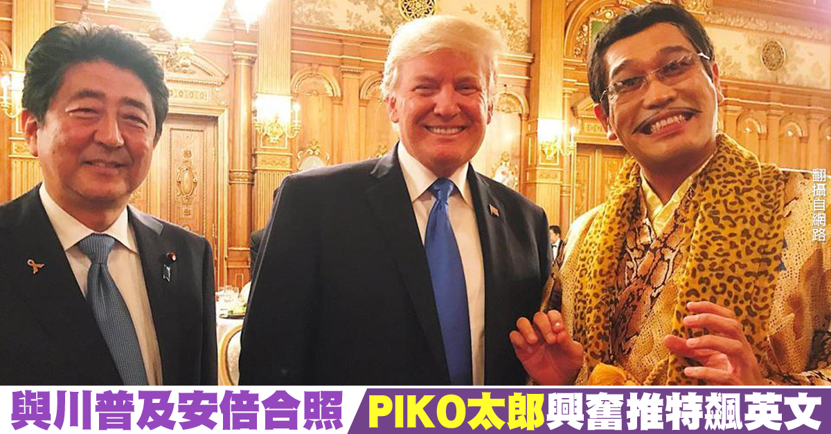 日本搞笑藝人PIKO太郎因《PPAP》爆紅,連美國總統川普的外孫女,都曾錄製模仿影片。為此,本次川普訪問日本,PIKO太郎也受邀出席迎賓晚宴。星期一晚間,PIKO太郎也在推特上傳了與川普及安倍的合照。寫道:「我實在太興奮了!聽川普講話呢!」