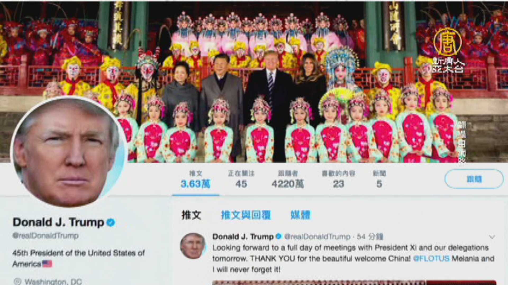 【新唐人亞太台 2017 年 11 月 09 日訊】再來也是外界很關注的一個議題,美國總統川普訪問中國,在中共防火牆箝制下,能不能順利使用推特?昨晚,川普不僅對4200萬粉絲 連續發多篇貼文, 還把推特帳戶的封面相片換成與習近平夫婦的合照。川普感謝習近平夫婦,讓他與夫人梅蘭妮亞在故宮度過難忘的時光,期待明天再相會。白宮官員說,這是川普跟美國人民直接溝通的方式,美方有滿足這個需求的設備。不過,之前有報導指出,在中共嚴打下,許多中國知名博主和活動人士被監禁。如果一條敏感帖子被轉發500次,發帖者可能被判3年。