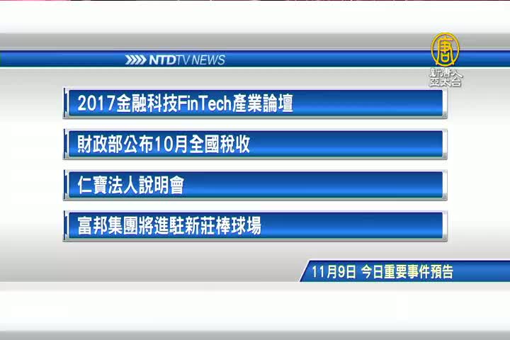 【新唐人亞太台 2017 年 11 月 09 日訊】接著看到,今天, 11月9日,星期四 ,有哪些重要活動。首先是,2017金融科技FinTech產業論壇。再來是,財政部公布10月全國稅收。繼續是,仁寶舉辦法人說明會。另外,富邦集團將進駐新莊棒球場,今天相關高層都會出席活動。