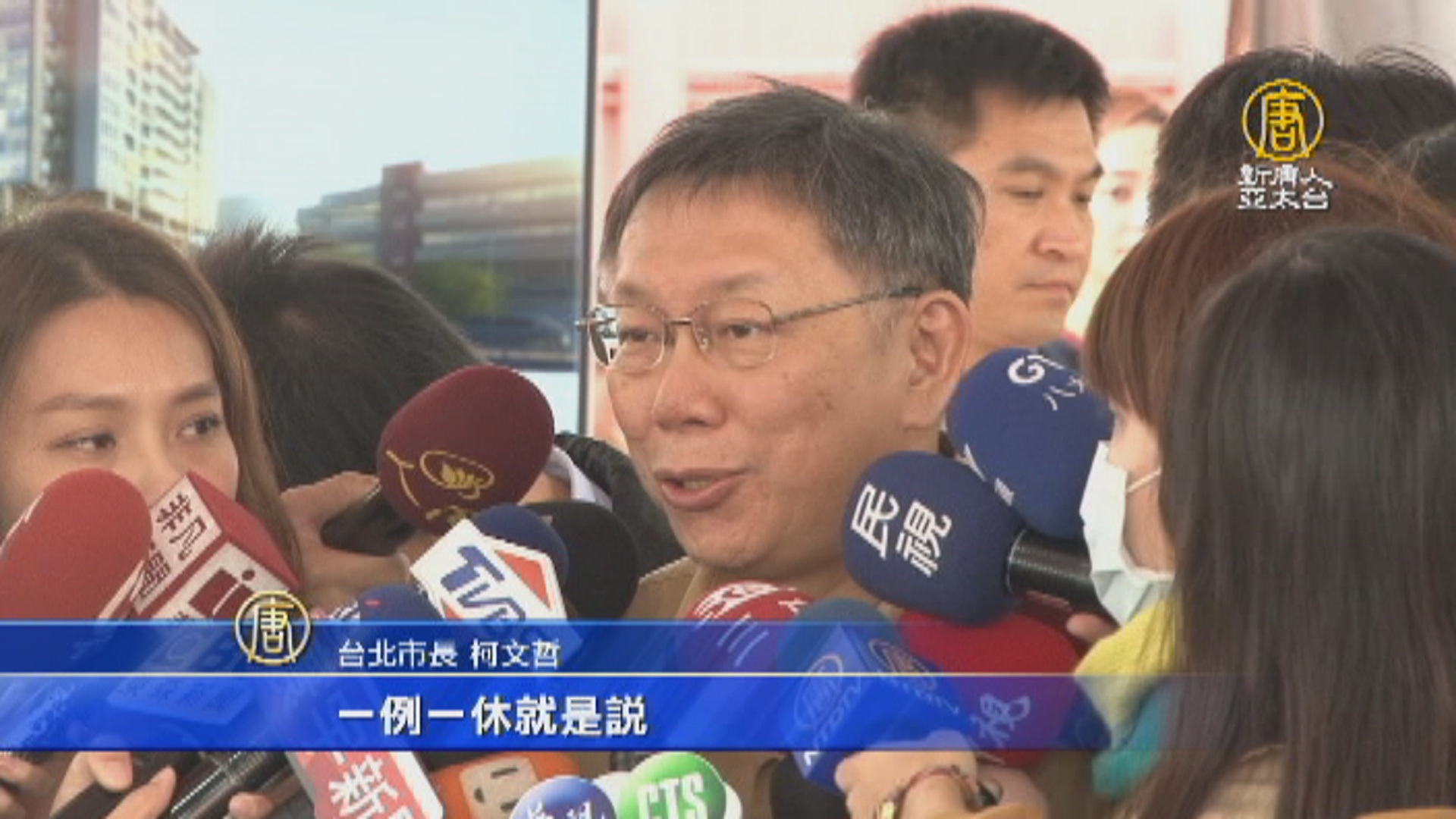 台北市長 柯文哲:「我很少三更半夜在發文你知道,我都因為我會怕人家說,政治上解讀說,柯文哲是不是又在砲打中央,甚至在放狗咬人你知道,所以還要趕快澄清一下。我的態度啦,一例一休就是說,你法令一旦公佈就要,就要能夠執行,從頭到尾都沒有執行那乾脆修一修算了,這是我的態度。那當然賴局長她是,她是勞工運動出身的,她一定會站在勞工的立場講話嘛,那我們台北市政府的特色就是說,我們都不太,我們都很尊重專業嘛,也不會去說不准她講。」
