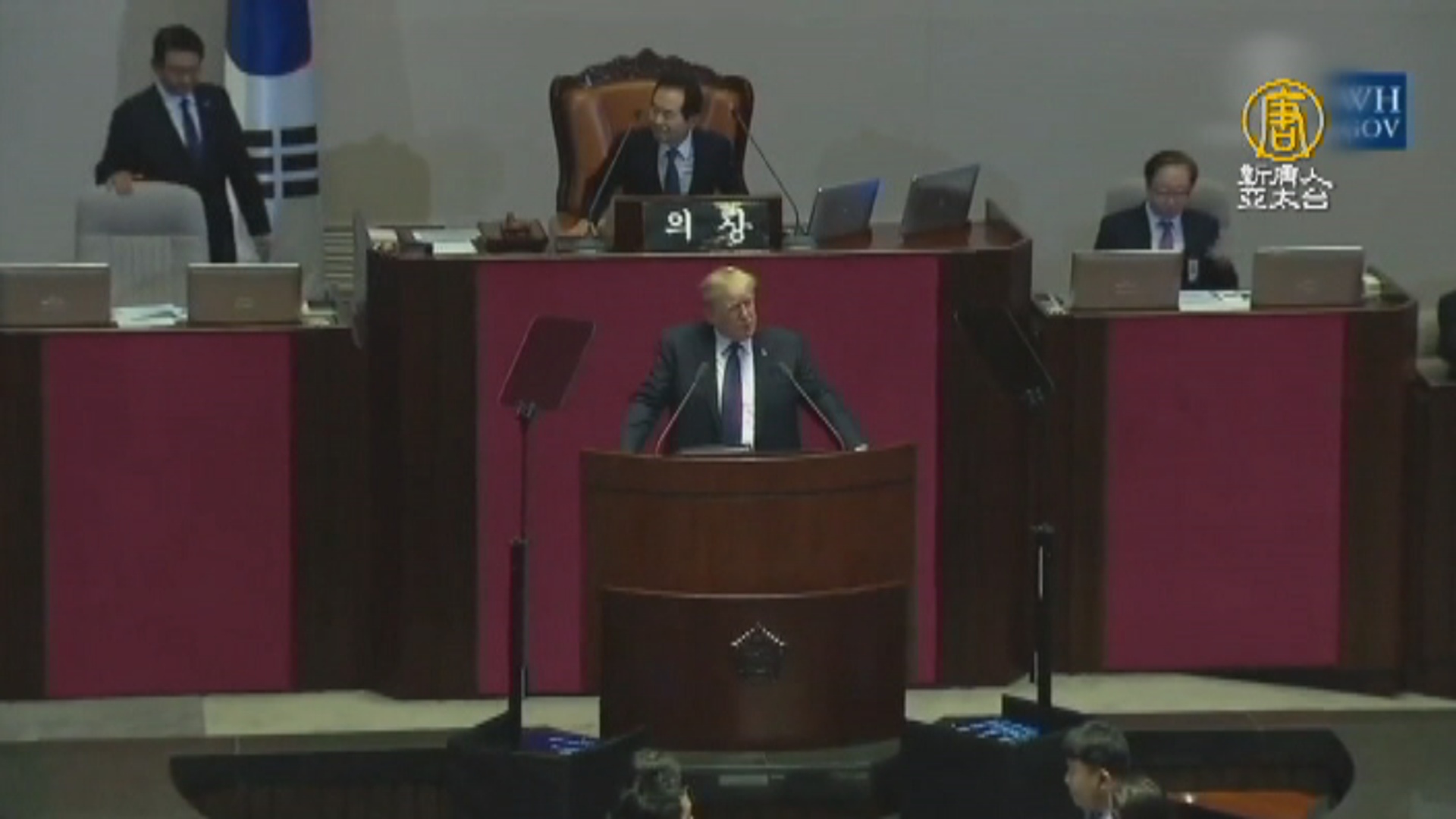 【新唐人亞太台 2017 年 11 月 09 日訊】川普在抵達中國前,先前往韓國國會發表演說,他除了嚴厲警告北韓,還說南韓越成功,金正恩政權會越害怕。35分鐘的演講,獲得南韓議員22次熱烈掌聲。